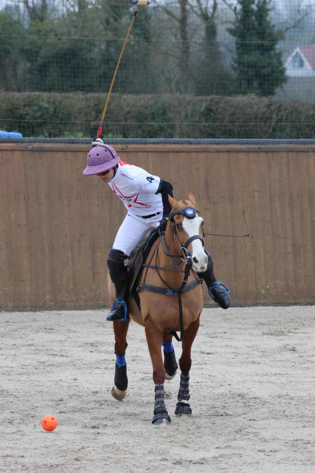 The arm extends with the palm facing outward (supination), maintaining a 90° angle between the mallet and forearm—everything perfectly parallel to the horse’s forward axis.
